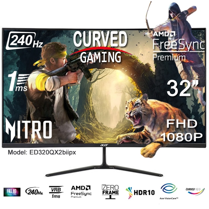 شاشة آيسر نيترو ED320QX2biipx بحجم 32 بوصة منحنية للألعاب – معدل تحديث 240Hz، زمن استجابة 1 مللي ثانية، 2x HDMI، DisplayPort، مخرج صوت، اللون الأسود